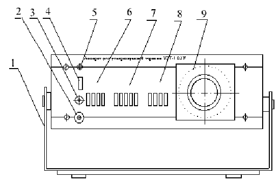 1- ручка, 2- разъём ВЫХОД для подключения кабеля излучателя, 3- индикатор выходного напряжения, 4- выключатель СЕТЬ, 5- индикатор включения сети, 6- переключатель ИЗЛУЧАТЕЛИ, 7- переключатель ИНТЕНСИВНОСТЬ, ВТ/СМ2, 8- переключатель РЕЖИМ РАБОТЫ, 9- процедурные часы.