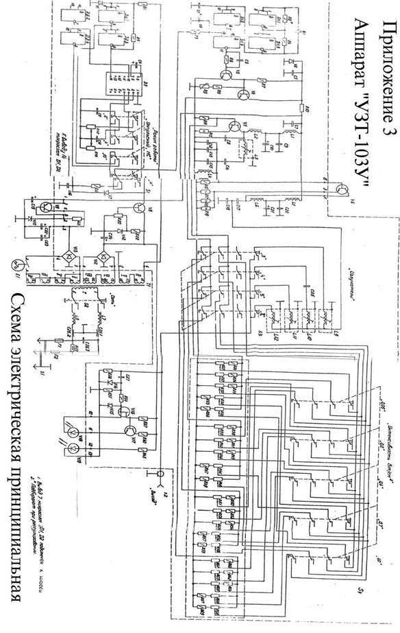 4.2.9. Аппарат питается от сети переменного тока частоты 50Гц номинальным напряжением 220В через автономный блок питания, включающий в себя трансформатор Т1 и два стабилизированных выпрямителя. Один из них (+6В) состоит из диодного моста V12 и параметрического стабилизатора напряжения (транзистор V8, стабилитрон V11, резисторы R20, R22). Другой (+50В)- из диодного моста V13 и параметрического стабилизатора напряжения (транзисторV9, стабилитрон V10, резистор R21). При изменении напряжения сети на 10% изменение напряжения на выходе стабилизированного выпрямителя не превышает 1%.