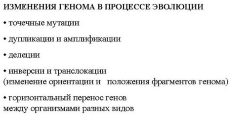 Каким образом, геномы бактерий меняются в процессе эволюции? Все изменения можно классифицировать на пять групп: точечные замены (замены одной «буквы» на другую), дупликации и амплификации (копирование участков генома), делеции (выпадение участков генома), инверсии и транслокации (перестановка участка гена в другую часть генома или изменение его ориентации в геноме), горизонтальный перенос генов (фрагмент ДНК переносится из одной бактерии в другую).