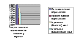 Анализ данной диаграммы позволяет сказать, что сравнительная характеристика энергетической адекватности рациона мужчин Москвы ближе к верхней планке нормы, а рацион мужчин Краснодара находится в среднем диапазоне нормы потребляемых килокалорий.