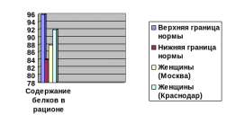 Анализ данной диаграммы позволяет сделать вывод о том, что энергетически питание обеих групп находится в пределах нормы. Однако следует сказать, что у женщин Москвы наблюдается приближение к верхней границе допустимой нормы, что при снижении физической нагрузки может стать избыточно-калорийным питанием.