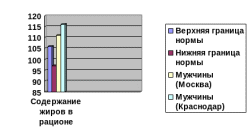 Данная диаграмма наглядно показывает, что если жительницы Москвы по содержанию жиров в рационе находятся в пределах нормы суточного потребления жиров (ближе к нижней ее границе), то жительницы Краснодара превышают среднюю суточную норму потребления жиров.