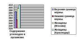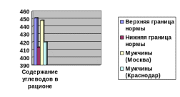 Анализируя полученные данные, следует сказать, что женщины и Москвы и Краснодара превышают предельно допустимую норму суточного потребления углеводов в своем рационе. Причем более выражено это у жительниц Краснодара.