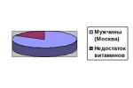Для оценки содержания водорастворимых витаминов (С, витамины группы В, липоевая кислота) мы также опирались на результаты случайной выборки пяти рационов из каждой группы опрошенных. Если условно принимать общую суточную норму водорастворимых витаминов за 100%, то мужчины Москвы потребляют 82,2 % необходимого количества, мужчины Краснодара-92,5 %, женщины Москвы-73,8 %, женщины Краснодара-96,6 %. Во всех группах явно недостаточное потребление водорастворимых витаминов .(Приложение 3)