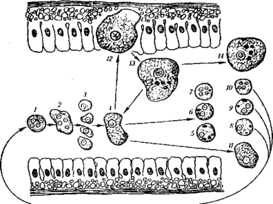 Рисунок 2.1 - Схема життєвого циклу амеби дизентерійної (Entamoeba histolytica)