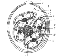 1 – полярная шапочка, 2 – микропиле, 3 – наружная оболочка, 4 – внутренняя оболочка, 5 – полярная гранула, 6 – штидовское тельце, 7 – спора, 8 – спорозоит, 9 – ядро спорозоита, 10 – полярное тельце спорозоита, 11 – остаточное тело споры, 12 – остаточное тело ооцисты.