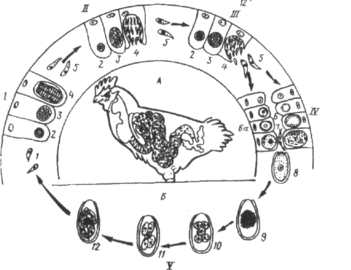 В желудочно-кишечном тракте цыпленка вышедшие из ооцист спорозоиты поражают эпителиальные клетки крипт. Здесь через 24 — 48 ч заканчивается развитие шизонтов первой генерации.