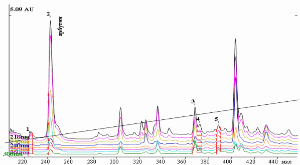 Также сейчас распространяется идентификация фенолгликозидов с помощью метода ВЭЖХ [16, 20]. На рисунке ниже (риcунок 7) показана ВЭЖ-хроматограмма водного экстракта зимолюбки зонтичной, на которой по УФ-спектрам в сравнении с достоверным образцом идентифицирован арбутин. В данном конкретном случае, анализ проводился на высокоэффективном жидкостном хроматографе «Миллихром-А-02» с последующей компьютерной обработкой результатов исследования с помощью программы МультиХром-СПЕКТР для Windows. В качестве неподвижной фазы использовали колонку ProntoSIL 120-5-C18 AQ, №80303 размером 2,0×75 мм, размер частиц – 5,0 мкм; в качестве подвижной фазы – [4M LiClO4+0,1M HClO4] : H2O в соотношении 5:95. Скорость подачи элюента – 100,00 мкл/мин. Температура – 40 °C. Давление – 2,0 MPa. Продолжительность анализа – 115 мин. Параллельно с испытуемым раствором в хроматограф вводились растворы достоверных образцов арбутина, гидрохинона и рутина. Детектирование данных веществ проведены по УФ-спектрам при длинах волн 210–300 нм [14].