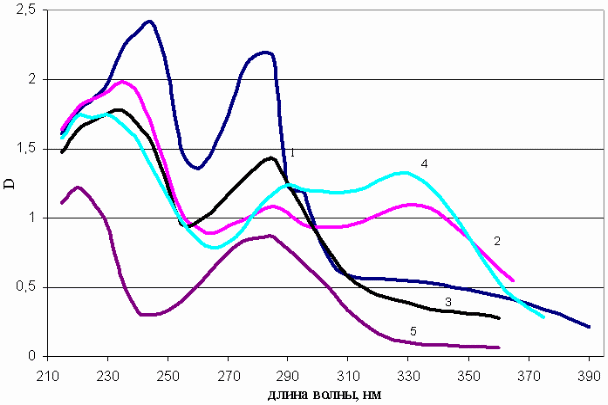 Рисунок 6 - УФ-спектры этанольных экстрактов листьев брусники (1), толокнянки (2), зимолюбки (3), черники (4) и голубики (5)