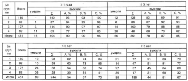Выжτ = Выжτ-1 - 1(Умτ - Умτ-1) + Неизвt", где Умτ и Умτ-1 – число умерших, соответственно, в данный и предшествующий периоды наблюдений, Неизвτ – число ОБ с неизвестным результатом лечения в данный период наблюдения τ. Таблицы 2 и 3 составлены по данным в каждой группе онкобольных с указанием конкретных онкозаболеваний.