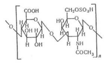 Хондроїтинсульфатна кислота також є гетерополісахаридом. Молекула її побудована з фрагментів глюкуронової кислоти і N-ацетилгалактозамінсульфату, сполучених між собою 1,3-глікозидними зв'язками: