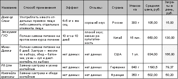 Средняя стоимость этих препаратов колеблется от 105 до 1 420 рублей за упаковку; таким образом, при пересчете на день (с учетом размеров упаковки и инструкций по использованию) затраты на похудение составляют от 15 («Доктор Слим») до 178,8 («Мини-Диета») рублей в день. Следует отметить, что большинство нутрицевтиков может использоваться как для снижения веса (при замене ими обычной пищи), так и для его набора (при совмещении обычной пищи с приемом препарата). При этом нутрицевтики могут использоваться как в качестве полной замены питания на несколько дней («Экстракт ГУО», «Мини-Диета»), так и в качестве частичной замены одного или нескольких приемов пищи в день («Доктор Слим», «Fit Line», «Коктейль красоты»).