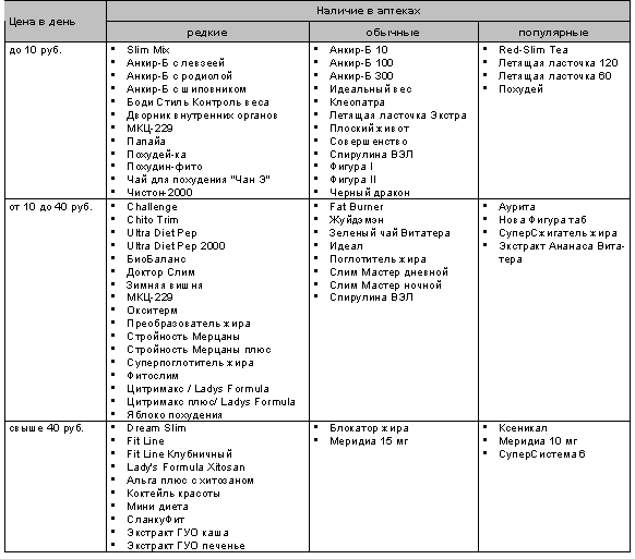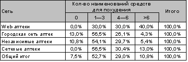 Различные средства для похудения представлены на рынке России достаточно хорошо — они имеются в 92,8% обычных аптек и во всех web-аптеках. При этом средства для похудения есть в продаже в 87,0% городских аптек, в 89,2% независимых аптек и во всех сетевых аптеках (табл. 1).