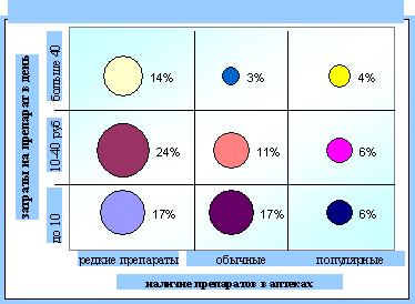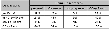Следует отметить, что подавляющее большинство препаратов (54%) относятся к группе редких (то есть их можно обнаружить менее чем в 3% от общего количества мест продажи). В этой группе преобладают препараты в среднем ценовом диапазоне (они составляют 24%), однако доля дорогих и дешевых препаратов также достаточно велика (табл. 2, рис. 1). На втором месте по размеру находится группа так называемых «обычных» препаратов, встречающихся в 3—8% аптек. В этой группе преобладают дешевые препараты (их доля составляет 17%), в то время как доля дорогих препаратов ничтожно мала (всего 3%). В группе наиболее популярных препаратов (встречающихся более чем в 8% аптек) препараты всех ценовых диапазонов представлены более или менее равномерно (от 6 до 4%); однако если препараты стоимостью до 10 рублей в день попали в эту группу именно вследствие низкой цены и, соответственно, популярности у потребителей, то дорогие препараты попали в эту категорию благодаря активности фирм-производителей.