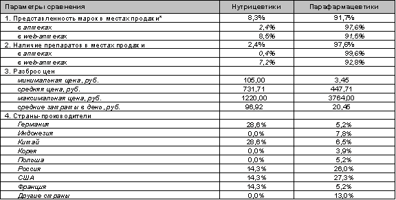На рынке препаратов для снижения веса нутрицевтики представлены плохо, их доля по маркам составляет только 8,3% от общего количества средств для похудения, а доля по частоте появления в аптеках — 2,4% (табл. 4). В основном нутрицевтики можно найти в Internet-магазинах (московских, но осуществляющих доставку лекарств во многие регионы России); доля нутрицевтиков по наличию марок в различных местах продажи составляет 7,2% в web-аптеках и 0,4% по обычным аптекам. В продаже имеются препараты как российского («Доктор Слим», разработанный в Самаре), так и иностранного производства. Среди нутрицевтиков иностранного производства встречаются китайские («Экстракт ГУО»), французские («Коктейль красоты»), американские и немецкие («Fit Line») препараты.
