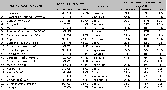 Перечень наиболее часто встречающихся препаратов для похудения приведен в табл. 9 (препараты отсортированы по убыванию частоты их появления).