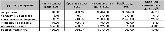 Цены на различные парафармацевтики колеблются в весьма широком диапазоне: от 10 руб. за упаковку микрокристаллической целлюлозы «Анкир-Б» производства ЗАО «Эвалар» до 3765 руб. за немецкий препарат «Меридиа» производства Knoll AG BASF Pharma. Следует отметить, что дороже всего обходятся аноректики и поглотители жира, а дешевле всего худеть с применением балластных и очищающих веществ (табл. 7). Так, средняя стоимость похудения с помощью аноректиков составляет 47,78 руб. в день, а если для этого использовать балластные вещества, то можно похудеть, тратя всего лишь в среднем по 4,4 руб. в день. Разброс цен на препараты одной и той же группы может доходить до трех с половиной тысяч рублей.