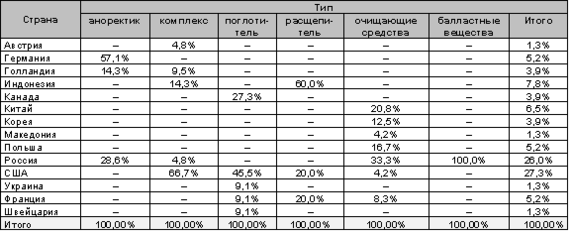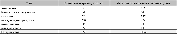 На рынке можно найти все типы парафармацевтиков — аноретики, сжигатели жира (как поглотители, так и расщепители жира), очищающие и балластные вещества, а также комплексные препараты, сочетающие в себе действие нескольких типов средств для похудения. При этом лидером по поставкам аноретиков является Германия (57,1% от общего числа аноретиков, представленных на рынке), комплексные препараты и поглотители жира поступают в основном из США (66,7% и 45,5% соответственно), большая часть расщепителей жира, представленных на рынке, произведены в Индонезии (60,0%). По очищающим веществам (к которым относятся в основном чаи для похудения) лидируют Россия (33,3%), Китай (20,8%) и Польша (16,7%). Что касается балластных веществ, то на рынке представлена только продукция отечественного производства (табл. 6).