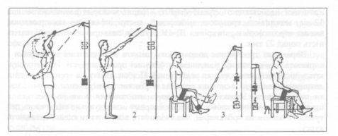 Рис. 2. Вправи на блоковому пристрої: 1,3 — зміцнення розгиначів кінцівок; 2, 4 — зміцнення згиначів кінцівок (за Д. А. Винокуровим, 1959)