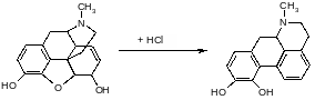 Под действием кислот разрывается кислородный мостик и этаминная цепь перемещается из положения 13 в положение 8. Происходит перегруппировка с превращением морфина в апоморфин (левовращающий). Его химическое строение отличается от строения морфина: апоморфин представляет собой почти плоскую молекулу, которую можно рассматривать как производное фенантрена и изохинолина.