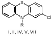 Гидрохлорид 2-хлор-10-(γ-диметиламинопропил)-фенотиазина (I*HCl) и 2-хлор-10-метилфенотиазин (V). Реакцию II (0,05 моль) и III проводят согласно [1], продолжительность отгонки воды 4,5 ч. Далее реакционную смесь промывают водой, смесь растворителей отгоняют в вакууме, остаток сушат до постоянной массы (16,13 г) и анализируют методом ГЖХ.