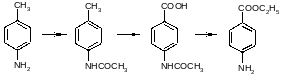 В качестве исходного сырья для получения этого продукта лучше всего применять р-нитротолуол, во-первых, потому, что его легко и дешево можно купить, и, во-вторых, потому, что отдельные фазы получения через этиловый эфир р-нитробензойной кислоты до эфира р-аминобензойной кислоты дают хорошие выхода и протекают гладко, хотя и требуют частично довольно продолжительного времени для завершения реакции [21]:
