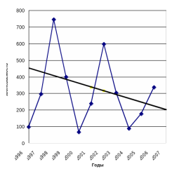 Вывод: Исходя из угла наклона тенденциозной прямой, который равен 9°, можно сделать вывод о том, что данный процесс (заболеваемость скарлатиной в населённом пункте “L”) является стабильным, стремящимся к снижению. Вследствие этого можно спрогнозировать показатель заболеваемости (Z) на будущий, 2007г., который составит приблизительно 206.