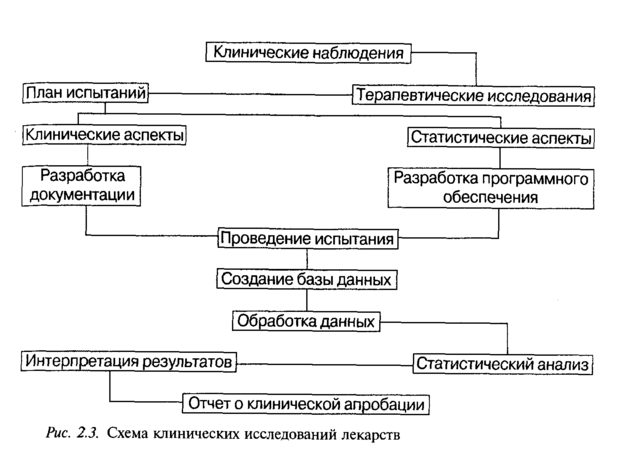 Программы клинических испытаний для различных фармакоте-рапевтических групп лекарственных препаратов могут значительно отличаться. Однако имеется ряд основных положений, которые всегда отражаются в программе: четкая формулировка целей и задач испытания; определение критериев выбора для испытаний; указание методов распределения больных в испытуемую и контрольную группы; число больных в каждой группе; метод установления эффективных доз лекарственного препарата; длительность и метод проведения испытания контролируемого препарата; указание препарата сравнения и/или плацебо; методы количественной оценки действия используемого препарата (подлежащие регистрации показатели); методы статистической обработки полученных результатов (рис. 2.3).