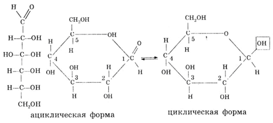 В растворе ациклическая (альдегидная) форма глюкозы находится в равновесии с циклической (полуацетальной) формой. При переходе ациклической формы в циклическую полуацетальную форму у первого углеродного атома формируется полуацетальная — гликозидная гидроксигруппа. По своим свойствам эта группа отличается от спиртовой. В циклической глюкозе, которая имеет строение кресла или лодки, полуацетальный гидроксил жестко расположен в пространстве относительно плоскости.