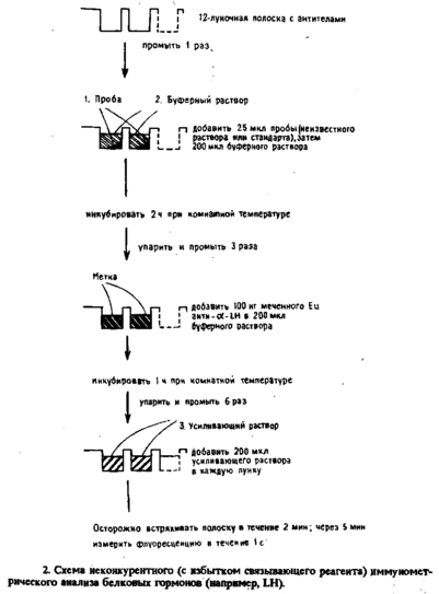 Мы разработали наборы, выпускаемые в настоящее время в промышленном маштабе, для определения лютеинизирующего гормона и фолликулстимулирующего гормона. Схема метода представлена на рис.2.