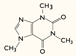 Химическое название кофеина – 1,3,7-триметилксантин. Соединяясь с водой, даёт кофеидин C7H12N4O. По строению и фармакологическим свойствам кофеин близок к теобромину и теофиллину; все три алкалоида относятся к группе метилксантинов. Кофеин лучше действует на центральную нервную систему, а теофиллин и теобромин – в качестве стимуляторов сердечной деятельности и лёгких мочегонных средств.