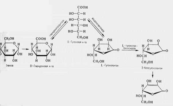 Аскорбиновую кислоту получают с помощью биосинтеза из глюкозы или галактозы. Схема синтеза наведена ниже.