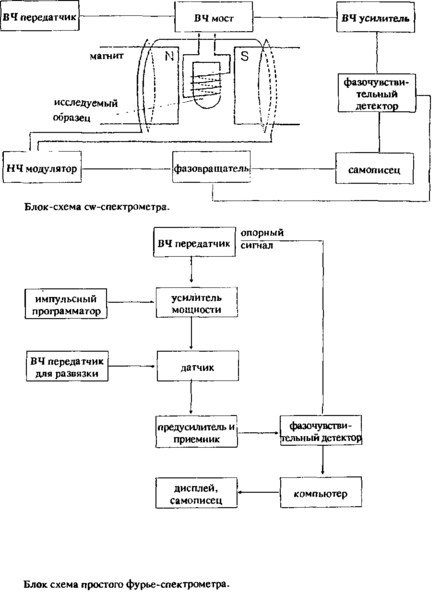 Конструкция всех ЯМР-спектрометров, как правило, достаточно проста, и конструктивные особенности отражают требования, предъявляемые к ЯМР-эксперименту. На рис. схематически представлена конструкция cw-спектрометра, а на рис - импульсного спектрометра. Конструкция ЯМР-томографа принципиально совпадает с конструкцией импульсного спектрометра. Далее подробно рассмотрим отдельные компоненты спектрометра и опишем принцип их действия.