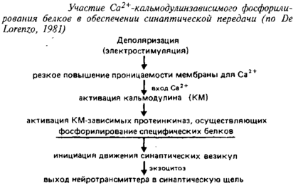 Кроме того, огромную роль в обеспечении функционирования синапсов играют процессы фосфорилирования белков, также связанные с потреблением АТФ или ГТФ. Циклы фосфорилирования – дефосфорилирования белков служат важным регуляторным механизмом, обеспечивающим пластичность на уровне нейронов. Процесс фосфорилирования является Са+-кальмодулинзависимым или циклонуклеотидзависимым; последнее обстоятельство делает понятным высокую t концентрацию циклических нуклеотидов и высокую активность ферментов их метаболизма в синаптических окончаниях. В синапсах процесс фосфофилирования специфических белков включается разнообразными нейромедиаторами. Изменение степени фосфорилирования белков, участвующих в функционировании синаптических окончаний, рецепторов, ферментов синтеза и метаболизма нейромедиаторов может существенно менять проводимость синапса; это доказано на примере фосфорилирования тирозингидроксилазы и ряда других белков.