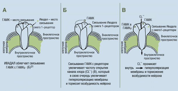 Известны три подтипа омега - рецепторов (известных ранее под названием бензодиазепиновых рецепторов). Большинство бензодиазепиновых снотворных связываются не селективно со всеми тремя подтипами рецепторов. В отличие от них, Ивадал является агонистом преимущественно омега-1 рецепторов (25,29). Исследования in vitro показали, что рецепторы омега-1, омега-2 и некоторые омега-3 рецепторы встречаются по всей центральной нервной системе, хотя омега-3 рецепторы больше распределены на периферии. Как выяснилось омега-1, омега-2 и омега-3 рецепторы располагаются на отдельной протеиновой субъединице макромолекулярного комплекса, ответственного за постсинаптическую рецепцию такого нейромедиатора как гамма-аминомасляная кислота (ГАМК) и представляют из себя хлоридный ионофор. При этом места связывания ГАМК или ГАМК-рецепторы (ГАМКp) располагаются на других протеиновых субъединицах ГАМК-рецепторного комплекса. Омега-рецепторы и рецепторы ГАМК находятся в аллостерическом взаимодействии. Связывание ГАМК с ГАМКp вызывает открытие хлоридного канала для перемещения ионов хлора внутрь нейрона. Это приводит к повышению отрицательного заряда на внутренней стороне клетки или гиперполяризации постсинаптической мембраны. Как следствие снижается возбудимость нейрона. Ивадал, связываясь с омега-рецептором повышает сродство ГАМК с ГАМК-рецептром , а также усиливает проникновение ионов хлора внутрь клетки посредством ГАМК-независимого механизма.