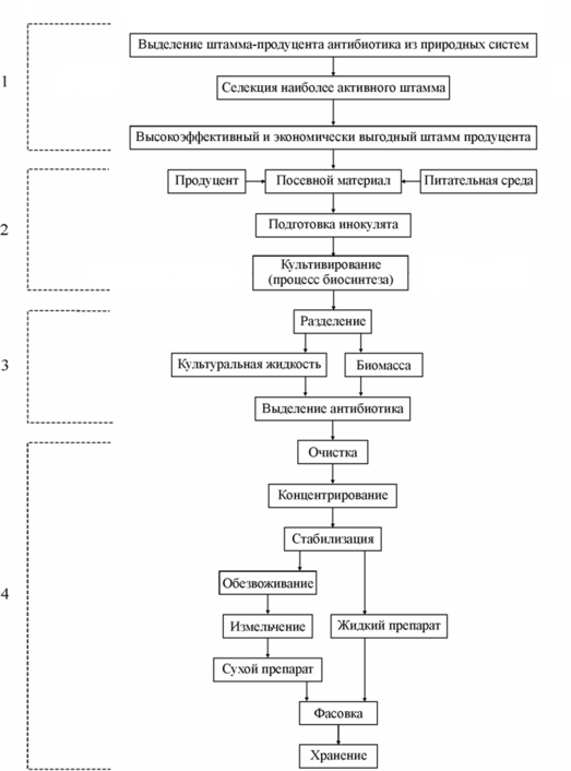 Процесс получения антибиотика включает в себя следующие основные стадии (рис. 1):