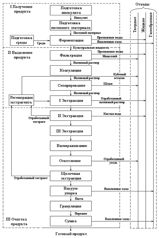 Выращивание посевного мицелия продолжается 36-50 часов до получения биомассы средней густоты. Мицелий, выращенный в инокуляторах, передается в количестве 10% по объему в посевные аппараты, где культивируется в течение 12-18 часов, а затем передается в большие ферментеры в количестве 15-20%. Процесс выращивания посевного мицелия 1-й и 2-й генерации осуществляется при температуре 24-26°.