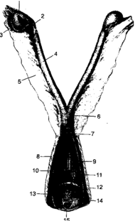 11 - влагалище; 12 - наружное отверстие уретры; 13 - железы;