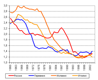 Рисунок 1. Коэффициент суммарной рождаемости в России, Германии, Испании и Италии0
