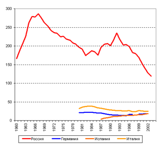 Рождаемость в России начала снижаться еще в конце XIX века и опустилась до очень низкой отметки − ниже уровня простого воспроизводства населения − во второй половине 1960-х годов, раньше, чем в большинстве промышленно развитых стран. То есть внутрисемейное регулирование рождаемости давно стало массовой практикой. При этом никаких программ планирования семьи в советское время не проводилось, соответствующая служба, которая занималась бы информированием, консультированием, медицинской помощью и обеспечением средствами контрацепции, отсутствовала, индустрия контрацепции не развивалась, более того, очернялись достижения западных стран в этой области, где в 1960-1970-е годы происходила настоящая контрацептивная революция. Зато в России была легко доступна процедура прерывания незапланированной беременности. Таким образом, желаемая «малодетность» в России обеспечивалась за счет небезопасного для здоровья искусственного аборта и «народных», малоэффективных методов контрацепции. Задача перехода к более цивилизованному способу регулирования деторождения, когда при помощи надежных и безопасных средств предотвращаются не рождения, а нежелательные зачатия, решалась очень медленно. В результате, имея те же тенденции и уровни рождаемости, что и другие развитые страны, Россия отличалась несопоставимо большим числом абортов (рис. 1, рис. 2).