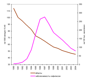 Рисунок 3. Уровень абортов (левая шкала) и заболеваемость сифилисом (правая шкала), Россия, 1990-2004 годы0