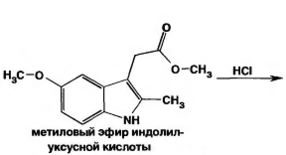 Синтез индометацина осуществляют конденсацией n-метоксифенил-гидразина с метилатом 3-ацетилпропионовой кислоты. Образовавшийся эфир индолилуксусной кислоты и гидролизуют и ацетилируют n-хлорбензоилхлоридом (схема 3):