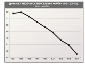 Досить подивитися на графік «Динаміка чисельності населення України 1991—2007 рр.», щоб зрозуміти: Україна скочується в демографічну прірву. За прогнозами Інституту демографії та соціальних досліджень НАН України, чисельність постійного населення України вже на 2050 рік може зменшитися до 36 млн. людей. За п’ятнадцять років країна втратила понад 6 млн. людей (що порівнянно з населенням таких країн, як Данія, Грузія, Шотландія, Фінляндія, Норвегія).