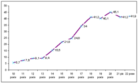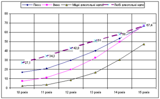 На діаграмі представлені дані (% з накопиченням), які свідчать про збільшення кількості молоді, котра вже спробувала пива, вина, міцних напоїв у 10 років. З них у віці 10 років 27% вже спробували один з спиртних напоїв, а в 15 років їх частка збільшилася до 67%.