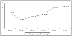За опитуванням учнів 5-9 класів шкіл м.Києва, у віці 15 років кожен п'ятий школяр хотів би кинути палити (діаграма х).