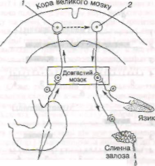 Мал. 1 - Рефлекторна дуга інтероцептнвного умовного рефлексу: 1 - кіркове представництво інтероцелторії шлунка; 2 - кіркове представництво слиновидільного безумовного рефлексу.
