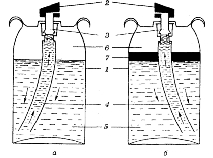 2 — розпилювач; 3 — клапан; 4 — сифонна трубка; 5 — розчин лікарської речовини; 6 — пари пропіленту; 7 — пропілент