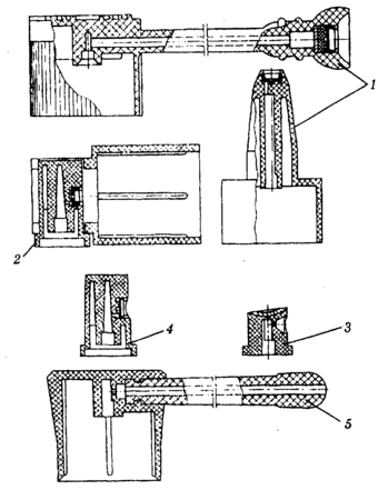 Вітчизняною фармацевтичною промисловістю випускаються чотири типи клапанів і дев'ять типів розпилювачів і насадок до них (мал. 23.2, 23.3). Їх підрозділяють на: розпилювачі для інгаляцій 1, для лікування бронхіальної астми 2, для суспензіонних 3 і плівкоутворювальних 4 аерозолів; насадки стоматологічні, ректальні, вагінальні 5 і ін.