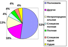 Для тех, кто ответил “нет” в предыдущем вопросе, предлагалось выбрать один из вариантов почему. Ответы распределились следующим образом: 53% ответили “полновата”, 18% респондентов отметили “другое” (но к сожалению не отметили свой вариант), 13% ответили “непропорциональная” и 4% опрошенных выбрали пункты “слишком полная”, “полная”, “худая” и “слишком худая”.