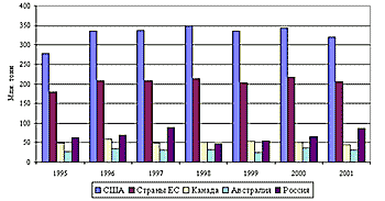 Баланс по пшенице для всего мира и основных стран-экспортеров в 2004 году, млн. тонн (по данным Минсельхоза США).